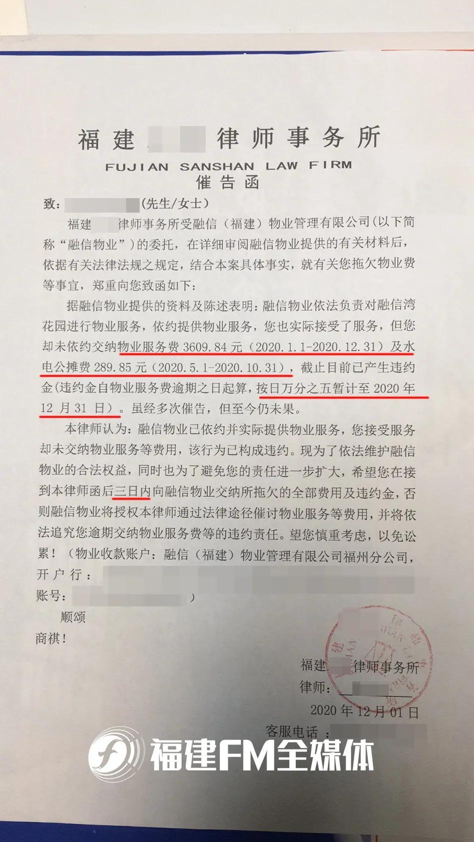 由于玻璃迟迟没有被修复,林女士认为小区物业没有尽到责任和义务,从2020年开始便不再缴纳物业费,目前刚好满一年,而就在12月5日,她却突然收到一封来自某律师事务所的“催告函”,要求她在三日内缴清物业费及水电公摊费共计3899.69元,以及相应的违约金。