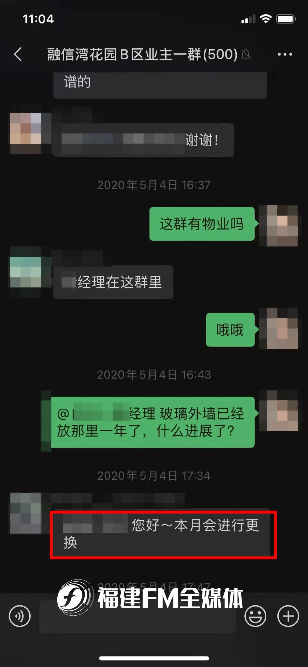 融信湾花园物业 叶先生:“有的业主因为产权还没办理好,有的则很难接受用公共区域的收益来帮其他人修房子外面的玻璃,所以工作进展还需要一点时间。另外更换玻璃也不是一片一片进行,我们都是一批一批对需要更换的玻璃量尺寸、设计方案、采购,这也需要时间。”