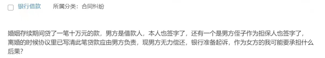 我在婚姻存续期间贷款十万元,男方是借款人,本人签了字,男方侄子作为担保人也签了字,离婚的时候协议里已写清此笔贷款应由男方负责,现男方无力偿还,银行准备起诉,作为女方的我可能要承担什么后果?