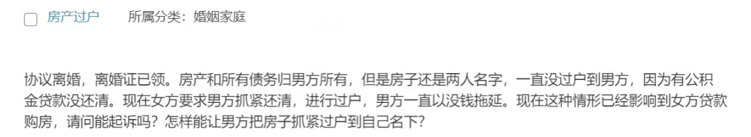 两人协议离婚,已领离婚证。房产和所有债务归男方所有,因为有公积金贷款没还清,所以房子一直没过户到男方,还是两人的名字。现在女方要求男方抓紧还清,进行过户,男方则一直以没钱为由拖延。现在这种情形已经影响到女方贷款购房,请问能起诉吗?怎样能让男方把房子抓紧过户到自己名下?
