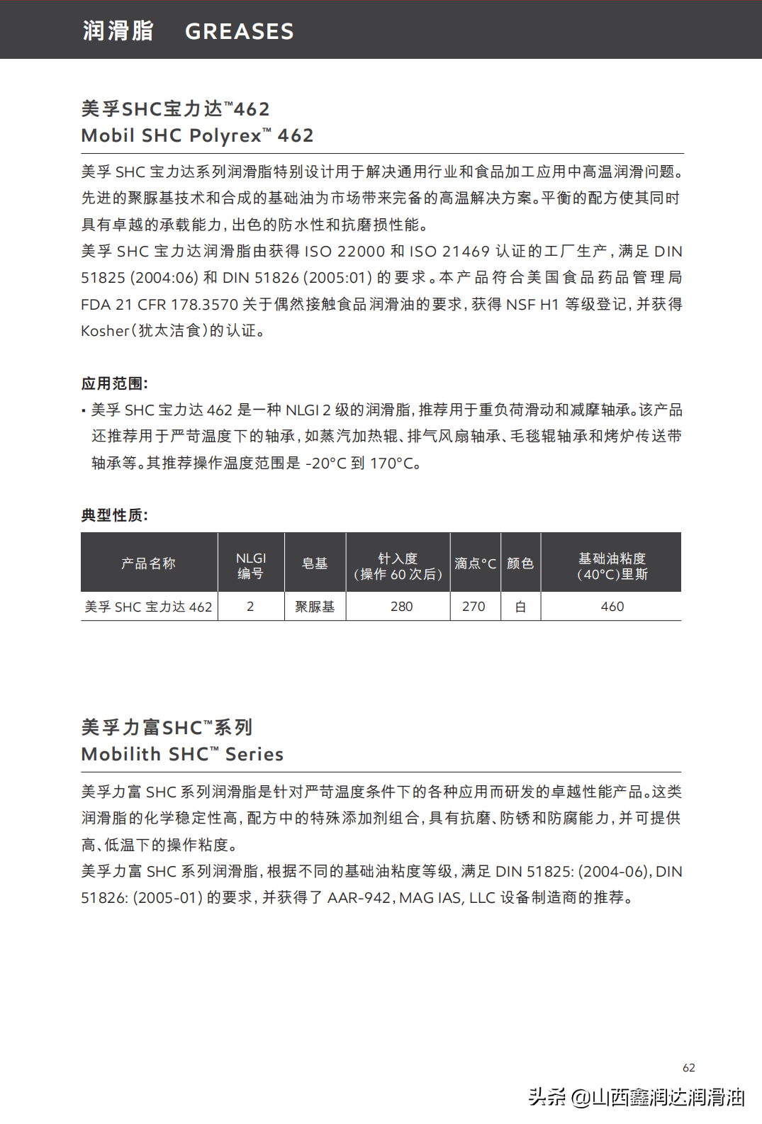 • 美孚 SHC 宝力达 462 是一种 NLGI 2 级的润滑脂,推荐用于重负荷滑动和减摩轴承。该产品还推荐用于严苛温度下的轴承,如蒸汽加热辊、排气风扇轴承、毛毯辊轴承和烤炉传送带