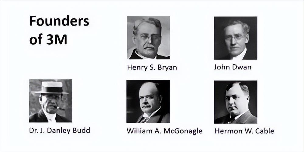 1902年,来自明尼苏达州北部双港村(Two Harbors)的五位商人Henry Bryan、Hermon Cable、Dr.J .Danley Budd、John Dwan和William McGonagle决定投资合作开一个公司。因为该地区附近发现了铁矿石等矿藏而繁荣,他们相信可以开采到用来做砂轮的超硬矿石刚玉。他们给公司起名为“明尼苏达矿业和制造公司”(Minnesota Mining and Manufacturing Co.),因为三个首字母都是M,公司后来就被简称为“3M”。
