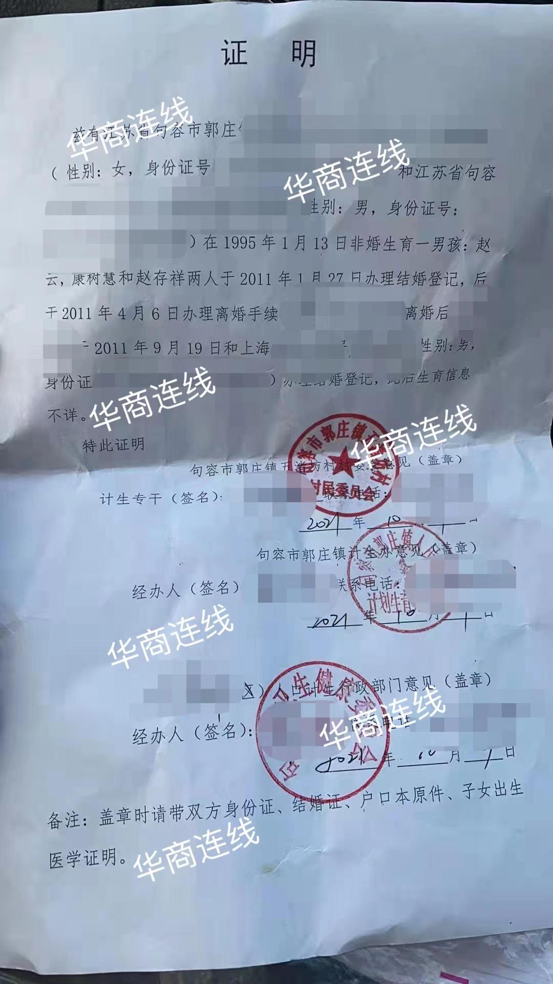 记者看到华女士持有的一份证明显示:华女士与小祥在1995年1月非婚生育一位男孩,2011年1月两人办理结婚,同年4月两人办理离婚手续。