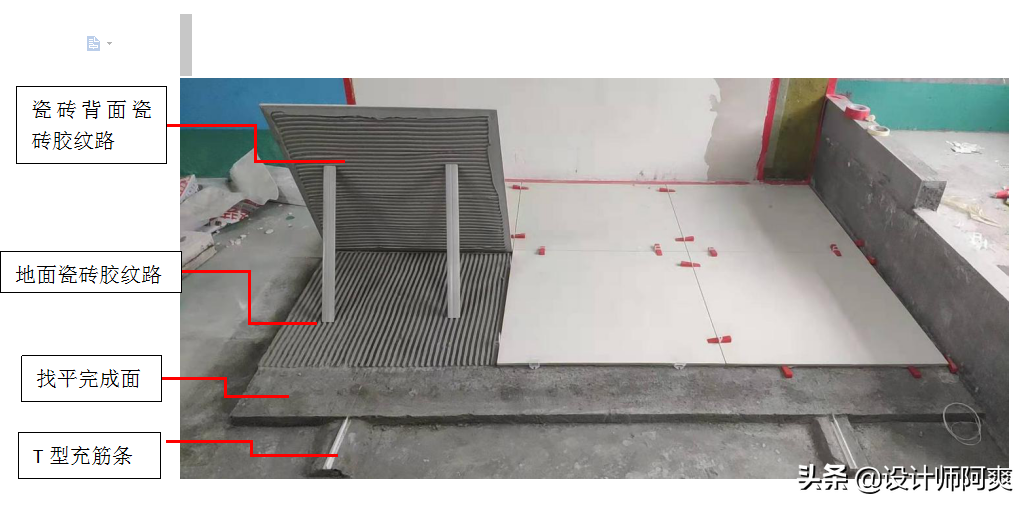 ▲ 墙压地是为了防止缝隙渗水积水发霉。需要从墙砖第二块砖开始铺贴,一直贴到顶部,然后贴地砖。贴完地砖之后,补贴第一块墙砖。