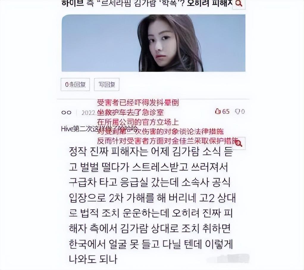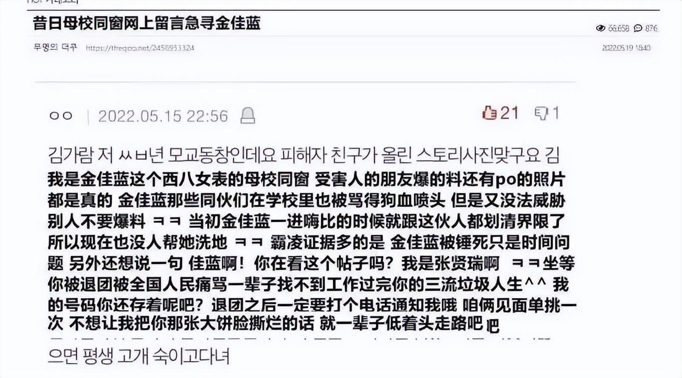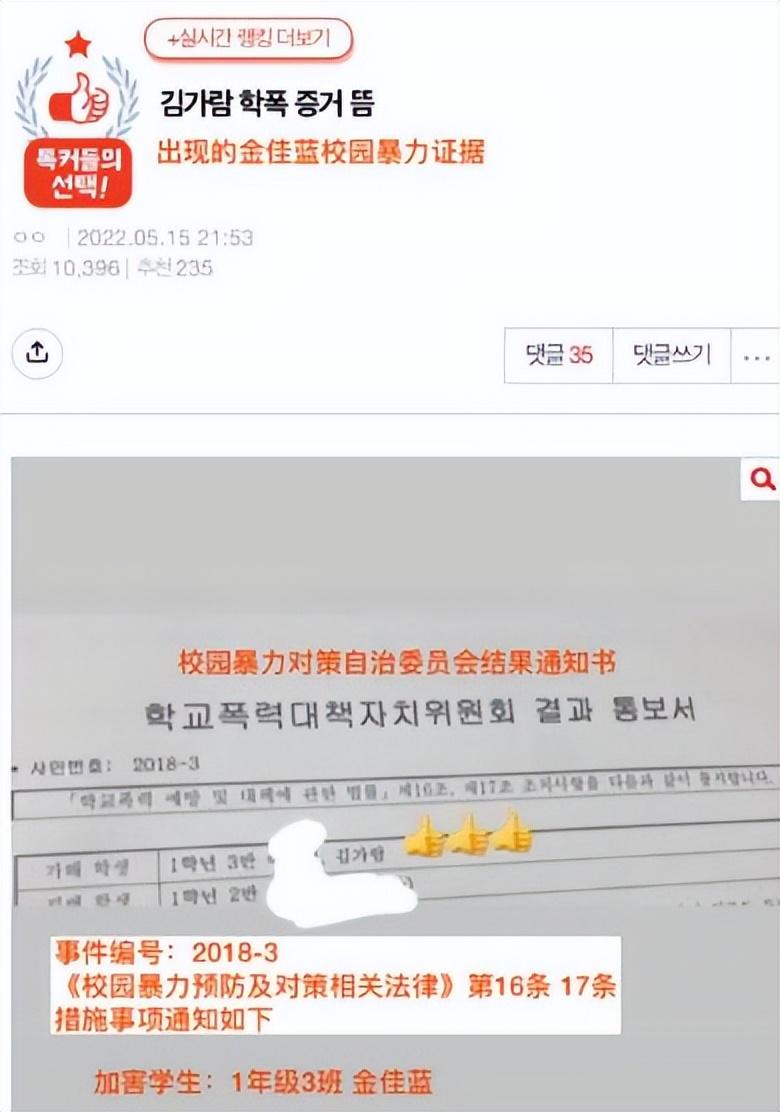 2022年5月份,韩网友爆料,被金佳蓝霸凌的受害者,因2次伤害致晕,被朋友送往医院急救。