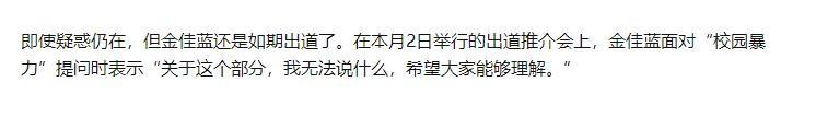 又因为舆论愈演愈烈,经纪公司为了让金佳蓝避风头,便以“心理受到创伤”为由,暂时中断她的活动。