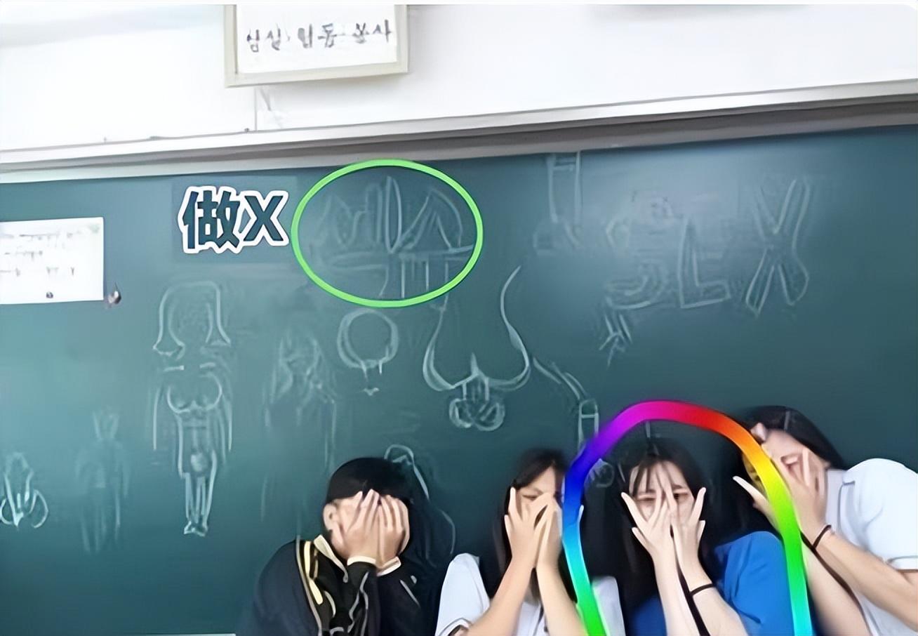 网友晒出金佳蓝在黑板前摆拍的照片,并配文:金佳蓝就是会在学校堂堂正正做这些事的人。而黑板上则是金佳蓝手绘的性器官图案。