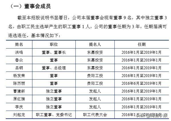 这是公司董事会组成人员及提名单位。第二股东贵阳市工投提名人选2名,第一大股东东嘉投资提名人选3人,反映了东嘉投资作为实际控制人的法律地位。