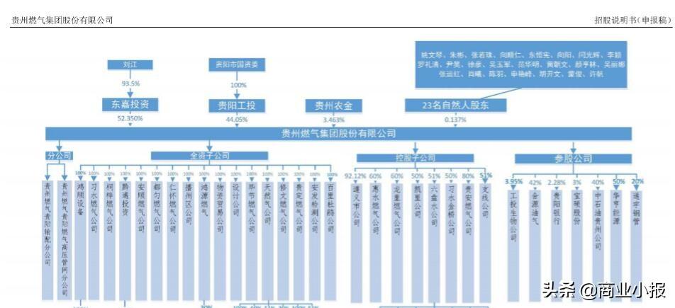 这是贵州燃气招股说明书里的股权结构图。刘江通过东嘉投资持有52.35%的股份,为第一大股东;第二大股东为贵阳市国资委,通过贵阳工投持有44.05%的股份。
