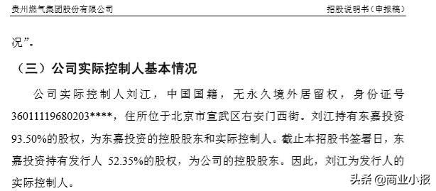 公司控股股东为成立于2003 年的北京东嘉投资。持有贵州燃气52.35% 的股权,而刘江持有东嘉投资93.50%的股权,为贵州燃气的实际控制人。
