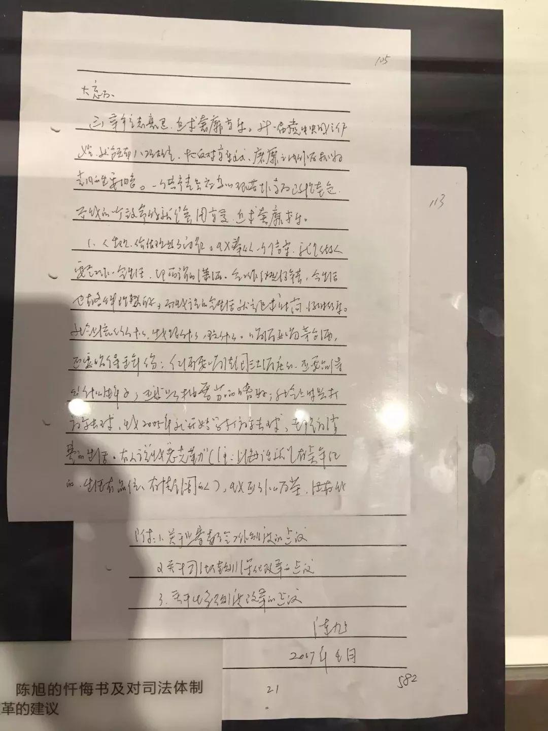 去年9月,政知圈(微信ID:wepolitics)曾在参观“砥砺奋进的五年”大型成就展时,看到过陈旭在2017年4月写的一份忏悔书。这份忏悔书还附了一份对司法改革的建议: