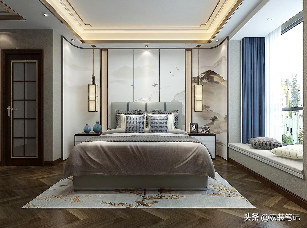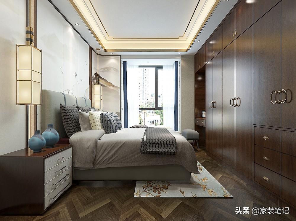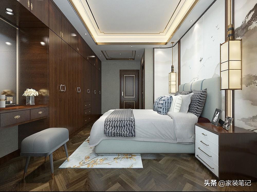 主卧室最引人注目的就是床头的设计了,弧形的造型特别有趣味。中式的画也很应景。同样吊顶采取了石膏板加金属材质的嵌入。地面是人字形的木地板铺贴,虽然工艺难点儿,但是效果很好看。床尾是一整面墙的衣柜,靠窗户那边预留了一部分出来做梳妆台,也可以做书桌使用,增加主卧室的实用性。