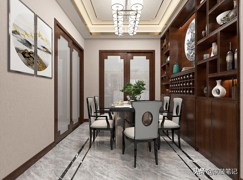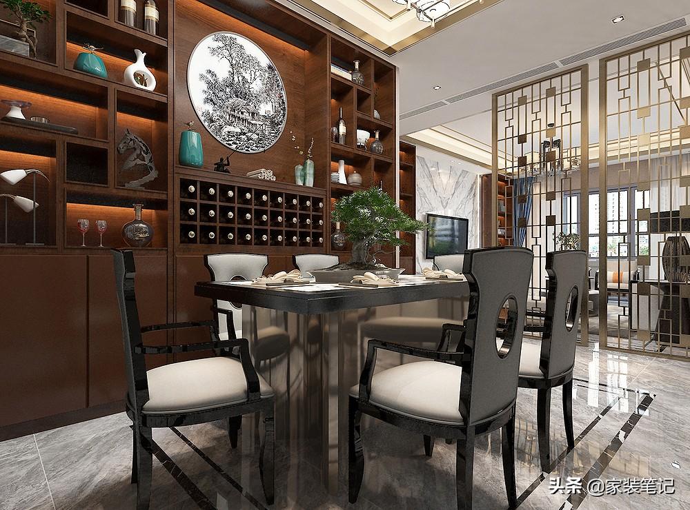 对比起客厅而言,这个餐厅空间还是略显小一些,所以只能摆放方桌,做完350mm厚的酒柜之后,整体来说显得有些拥挤。酒柜做得特别精美,储物也比较多样化,在酒柜的中间也还做了一幅比较相应中式风格的圆形艺术画。除了酒柜的墙面之外,餐厅有两面都是推拉门,所以整体来说还是略感压抑。