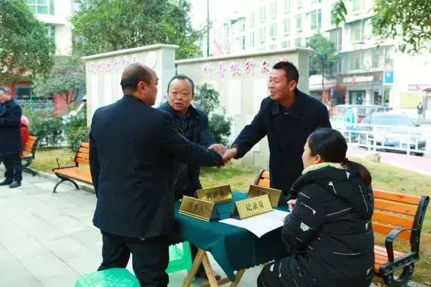 通过人民调解工作,群众握手言和,并向调解员表示感谢
