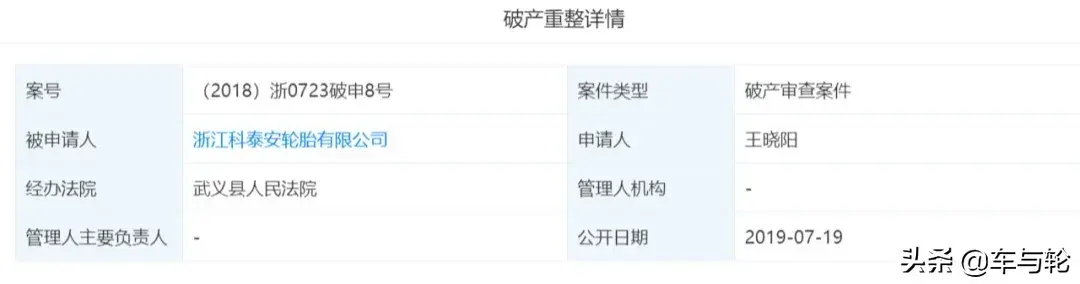 2018年,浙江科泰安轮胎申请破产重整未果。