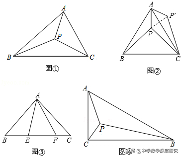 如图①,当△ABC三个内角均小于120°时,费马点P在△ABC内部,此时∠APB=∠BPC=∠CPA=120°,此时,PA+PB+PC的值最小.