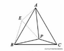 基本图形与结论:如图4,P点是等边△ABC(此特殊几何图形还可以为等腰直角三角形或正方形)内一点,PC,PB,PA均给出具体数值,且常是一组勾股数,以BP为一边,构造等边△BPE,连接AE(或将△BPC绕点B逆时针方向旋转60°得到△BEA.等腰直角三角形或正方形一般是旋转90°),即可由"手拉手"模型得到△BEA≌△BPC.再由"勾逆"得到Rt△AEP。 本图形中的P点类似于"费马点"。