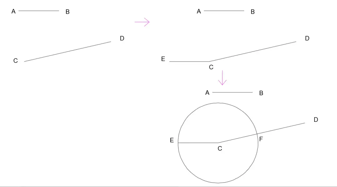 已知线段AB、CD,其中线段AB长于线段CD。目标:在线段AB上截取一段,使其等于线段CD。