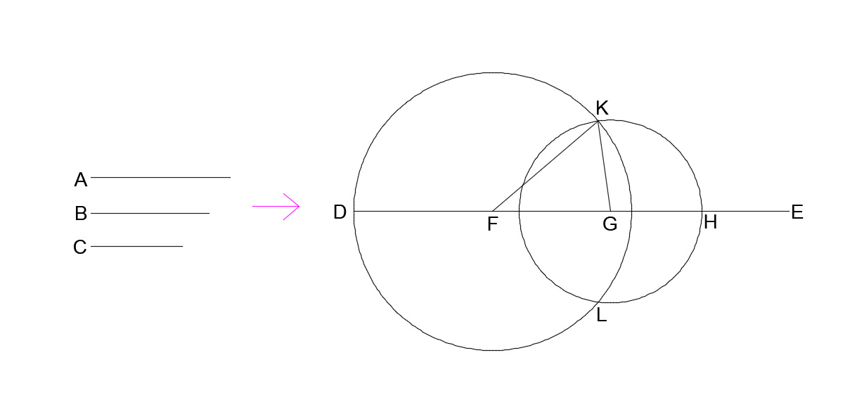 5、再以D为圆心,DG为半径,作圆GKL。(公设3)