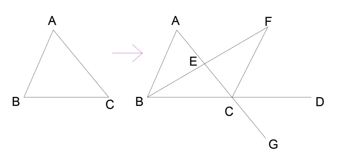 1、直线AD向两端分别延申至E、F,过点B作直线BE平行于AC,过点C作直线CF平行于BD。(命题31)