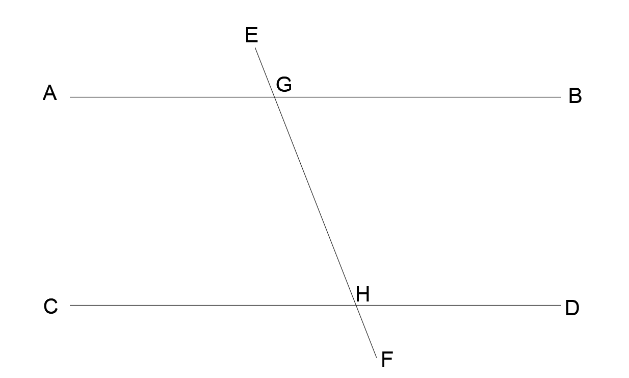 目标:证明内错角AGH=角GHD,同位角EGB=角GHD,且同旁内角BGH与角GHD的和等于两直角和。