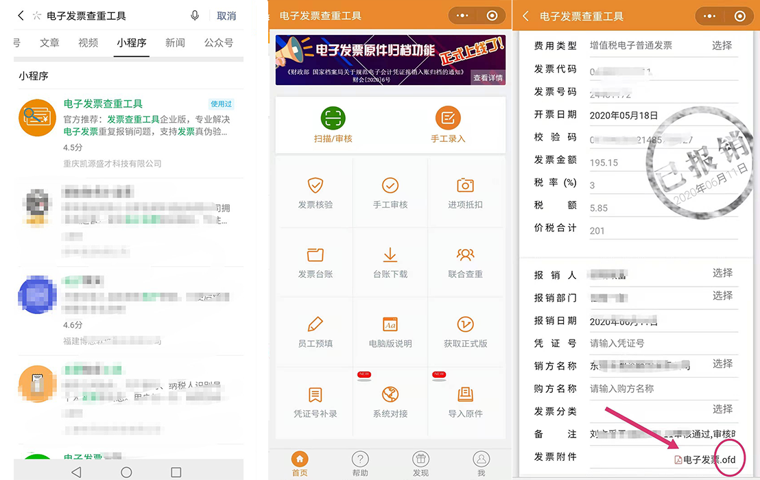 会计使用《电子发票查重工具|财务版》扫一下发票左上角的二维码,或者输入发票号码,就可以得到员工上传的信息以及原件,系统自动查重验真,没有弹出警示,就表示发票正常,直接通过自动生成台账保存。