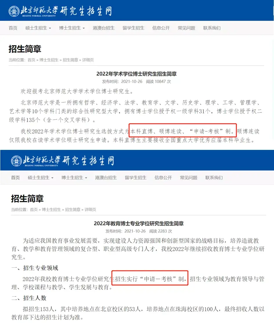 其中明确提到,北京师范大学2022年学术学位博士研究生选拔方式为本科直博、硕博连读、“申请-考核”制,教育博士专业学位研究生招生实行“申请―考核”制,均不再接受统招博士报名。