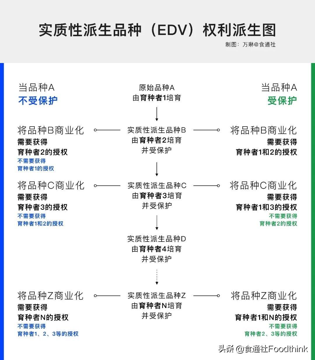 ●EDV制度的权利派生。当起点是不受保护的品种,谁派生谁授权;起点是受保护的品种,最后派生品种和原始品种的所有权人一起授权。两种情形都不需要中间其它派生品种所有权人授权。