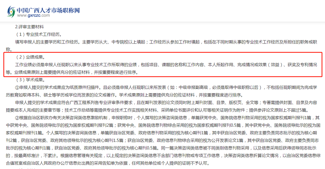 根据广西人才市场职称网下发的《[中国广西人才市场]中国广西人才市场职称改革领导小组办公室关于开展2022年度工程系列高级职称评审工作的通知》文件要求:工作业绩必须是申报人任现职以来从事专业技术工作所取得的业绩,包括项目、课题的名称和工作内容、本人所起作用、完成情况或效果(效益)、获奖及专利情况等。业绩成果原则上需要提供充分的佐证材料,并按重要程度进行排序。