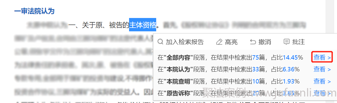 在案例中发现的关键词,或许会比“凭空想象”的更高效。快捷检索功能,将案例中的词或句,一键变成新的检索条件。