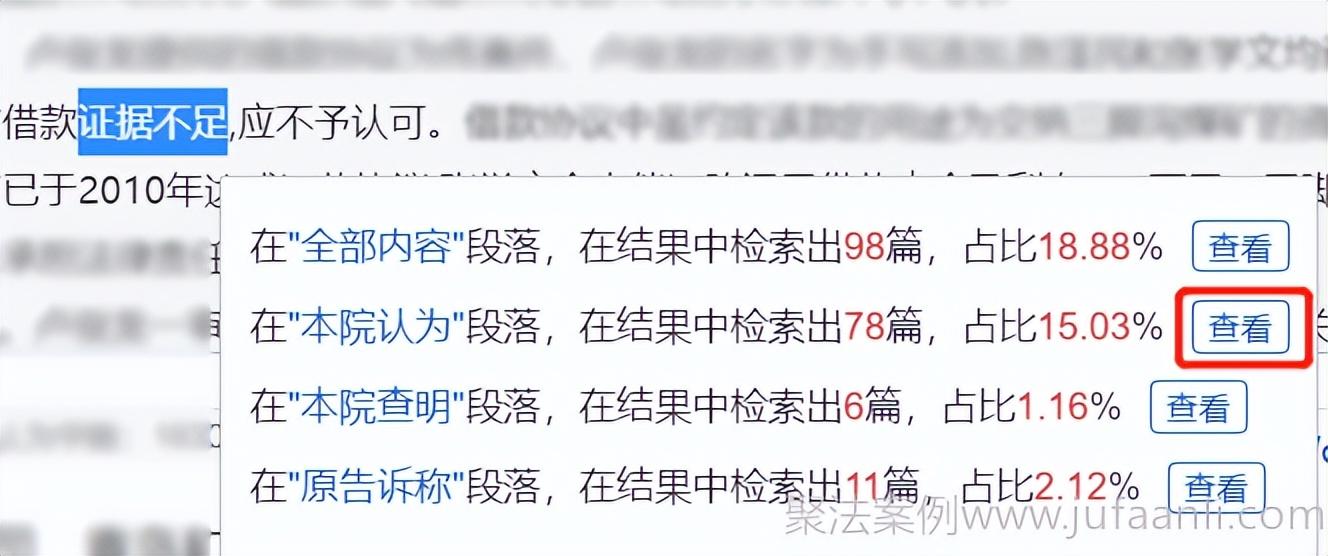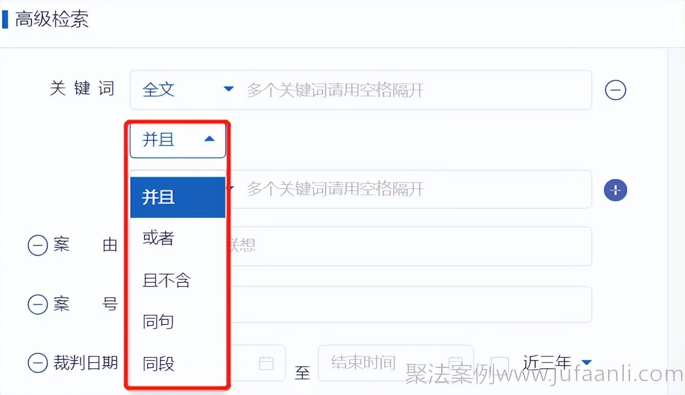 多个关键词,在案例中的位置越近,检索结果越少,案例符合检索需求的可能性越高。聚法案例的检索位置可以限制在全文、同段、同句中,支持并且、或者、且不含的逻辑关系检索。