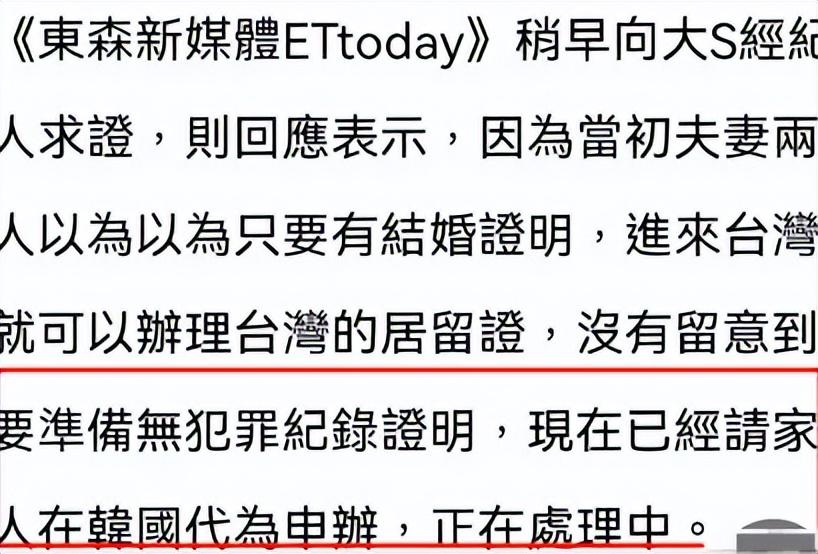 如今大S的经纪公司回应,说当初确实疏忽了,没有提前准备好这个证明,目前具俊晔正在让远在韩国的亲人代办,还在处理中。