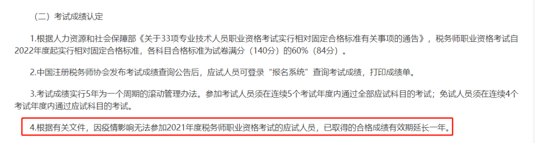 “因疫情影响无法参加2021年度税务师职业资格考试的应试人员,已取消的合格成绩有效期延长一年。”