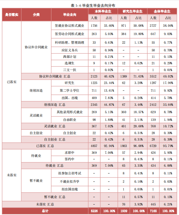 报告显示,本科毕业生毕业去向落实 4857 人,初次毕业去向落实率为 92.94%,主要毕业去向为:国内升学深造(1936 人,37.05%)、签就业协议形式就业(1756 人,33.60%)、出国(境)(409 人,7.83%)。