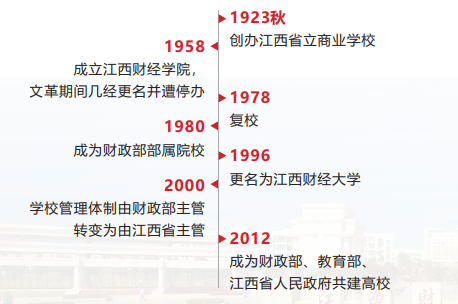 前身为1923年秋创办的江西省立商业学校,1958年成立江西财经学院,文革期间几经更名并遭停办,1978年复校,1980年成为财政部部属院校,1996年更名为江西财经大学,2000年学校管理体制由财政部主管转变为由江西省主管,2012年成为财政部、教育部、江西省共建高校。