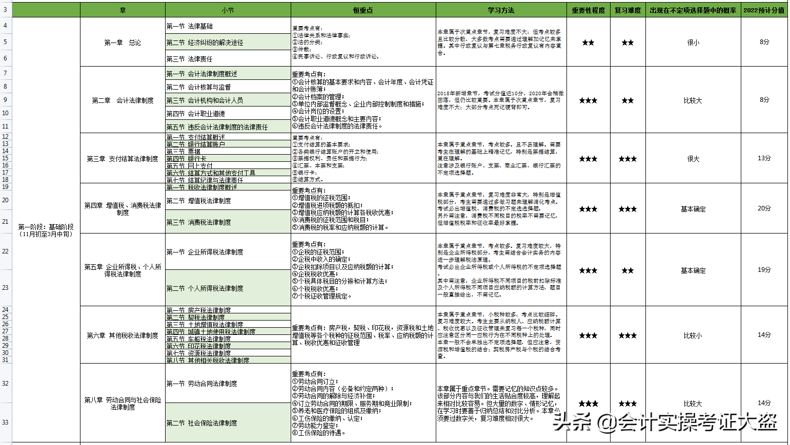 《经济法基础》分为两部分,一部分是经济法(第1-3章+第8章),一部分是税法(第4-7章)。其中税法部分分值占比60%以上,特别是第4、5章在全书中都非常重要。另外第3章理解难度较大,分值占比也相对较高。