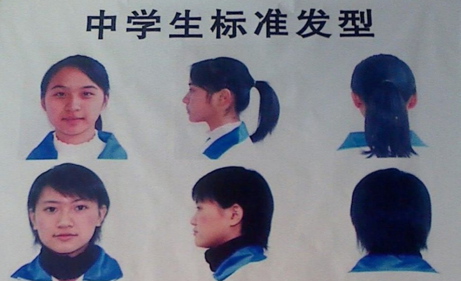 首先是女生坚决不能留长头发,理由是梳头发的时间会占用学生的学习时间。但是不能留长头发也罢了,该校对女生短发的要求也很严格,从该校的规范发型展示中我们可以看出,女生的短发和男同学其实没有什么两样。