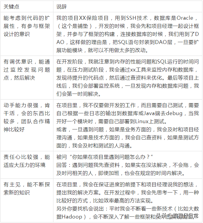 比如:在这个项目里用到了什么技术?你除了说一些基本的技术,比如Spring MVC,Hibernate,还有数据库方面的常规技术时,还得说,用到了Java内存管理,这样能减少对虚拟机内存的压力,或者说用到了大数据处理技术等。也就是说,得找一切机会说出你拿得出手的而且当前也非常热门的技术。