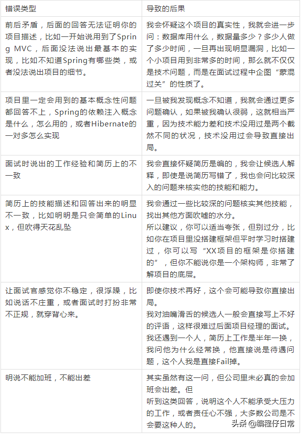 根据我们的面试经验,发现有不少候选人对此没准备,说起来磕磕巴巴,甚至有人说出项目经验从时间段或技术等方面和简历上的不匹配,这样就会造成如下的后果。