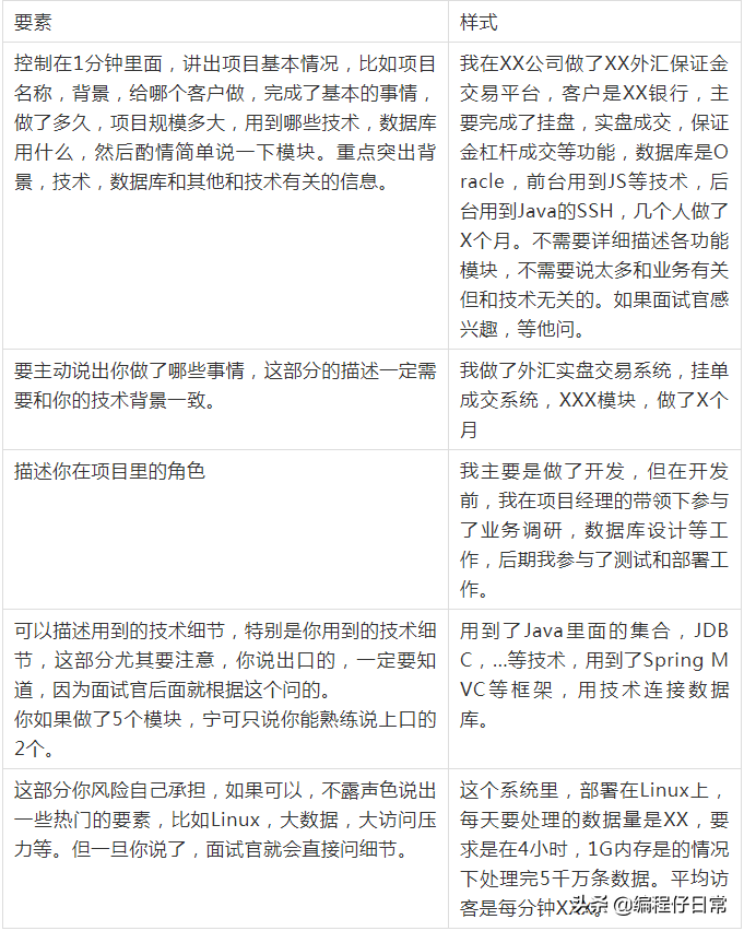 在避免上述不好的回答的同时,大家可以按下表所给出的要素准备项目介绍。如果可以,也请大家准备一下用英语描述。其实刚毕业的学生,或者工作经验较少的人,英语能力都差不多,但你说了,这就是质的进步。