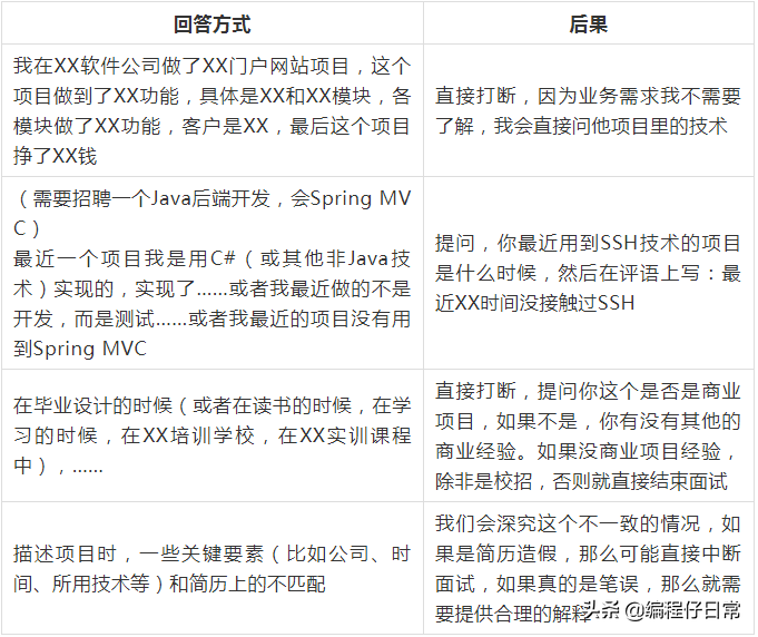 不少人是拘泥于“项目里做了什么业务,以及代码实现的细节”,这就相当于把后继提问权直接交给面试官。下表列出了一些不好的回答方式。