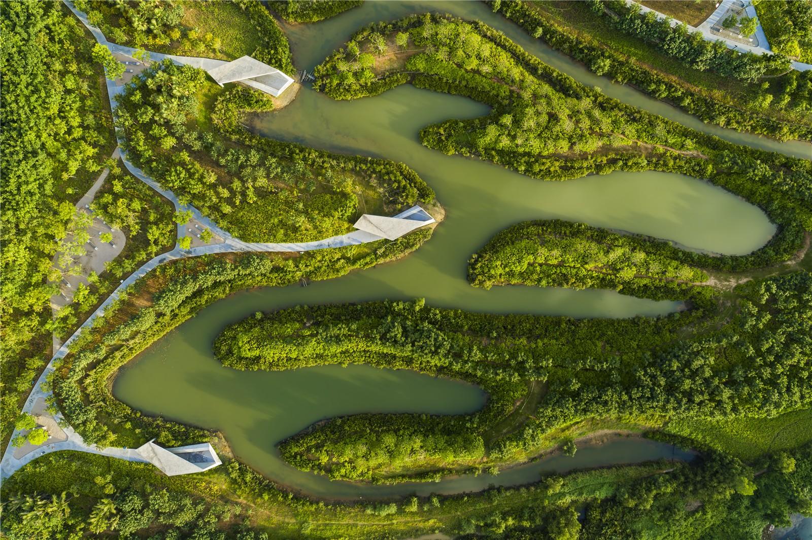 设计充分践行“山水林田湖草生命共同体”理念,通过点源和面源的污染治理,恢复 “江、渠、塘、湖、海、滩” 的自然交换功能,全面改善冯家江水体水质,自北向南形成湖库、基塘、红树及沙洲四大生境。在科学研究基础上建立植物培育基地,共计培育水生植物36种,研究其对当地环境的适用性以及改善水质、消解污染物的能力,自主培育南方碱蓬、阔苞菊等耐盐碱植物。