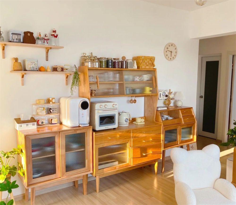 与此同时,这组餐边柜上面也收纳了各种各样的小电器,兼顾美观与收纳能力。