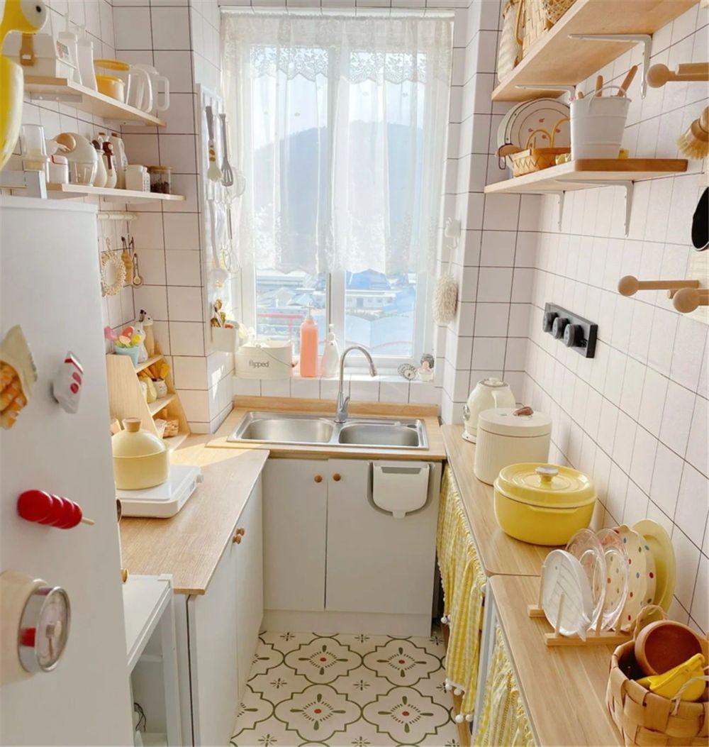 家里的小厨房,也经过了彻底的改造,虽然空间不大,但巧妙利用U形格局,作出了橱柜+隔板的结构,收纳下各种碗碟餐具,将空间充分利用起来。