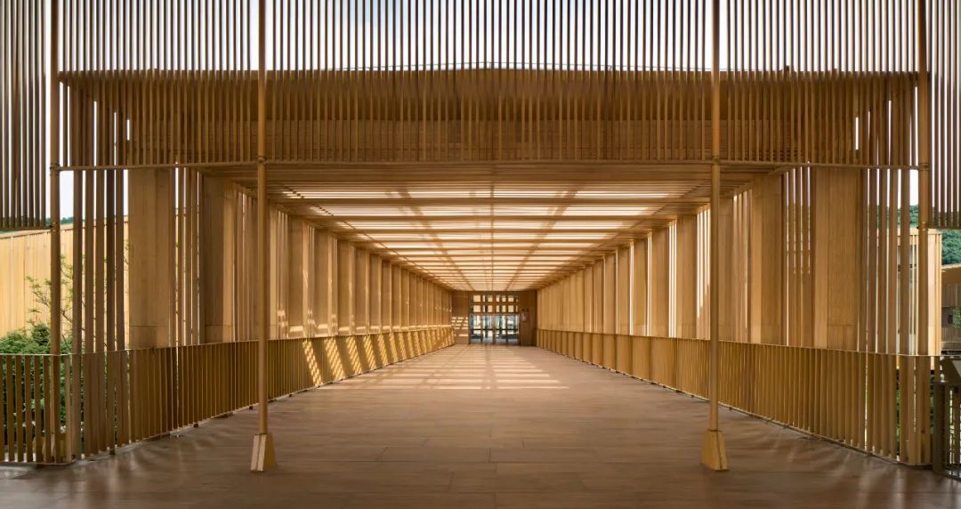 因建筑表面材料形似茅草,所以被当地人戏称为“茅草屋”,而实际上,这些材料是铝板百叶。它们茂密地穿插在一起,远看有自然纯朴的质感,延续了隈研吾一贯“建筑融于自然”的风格。