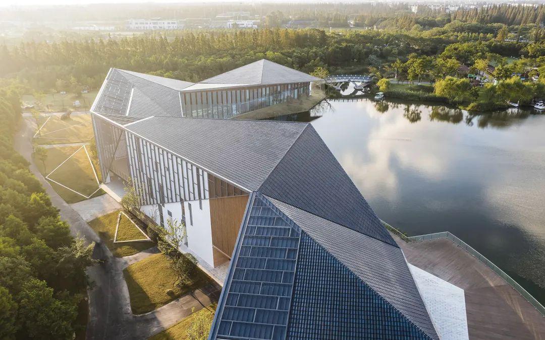 项目位于阳澄湖度假区的“美人腿”半岛中部,占地36.5亩远看三角屋面像起伏的小山丘,并且与周边的树林环境融合十分协调。