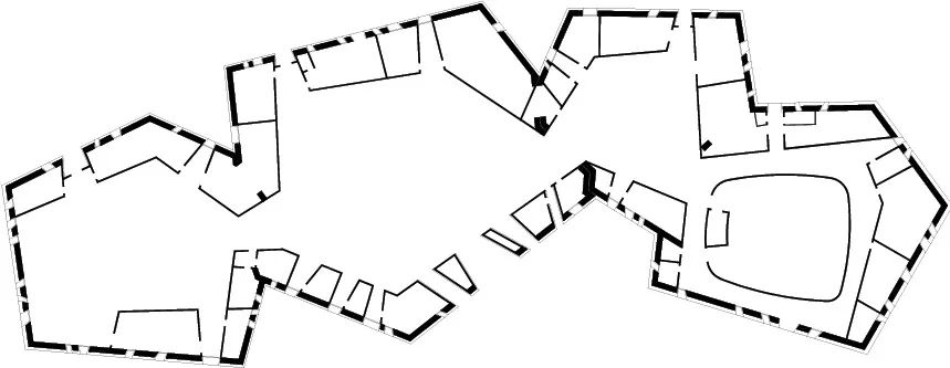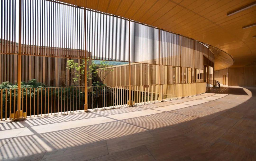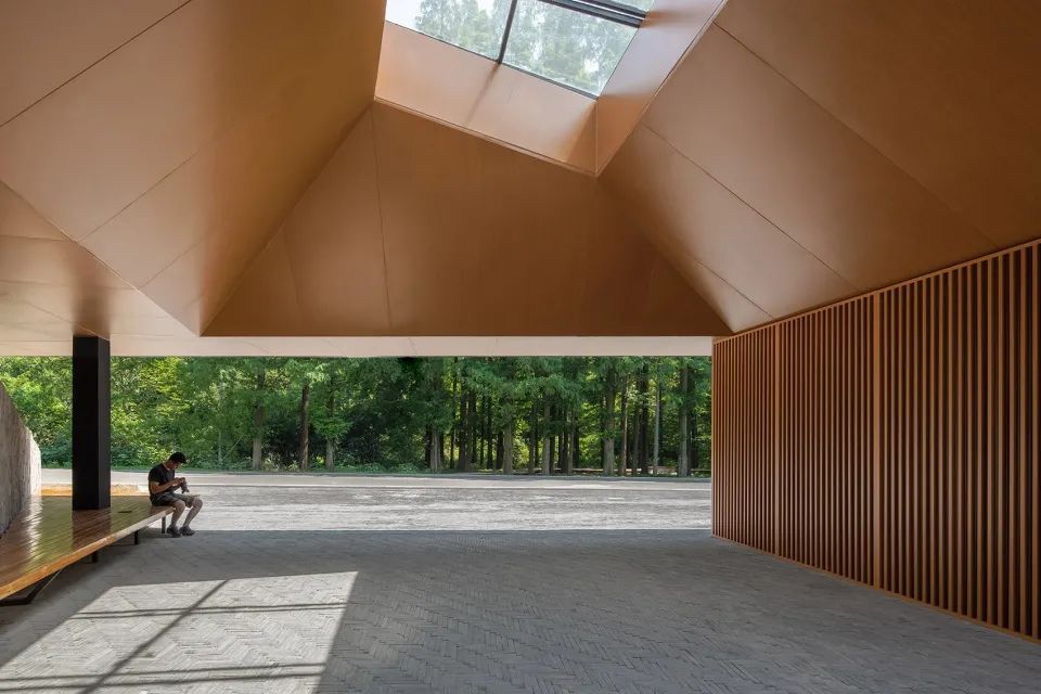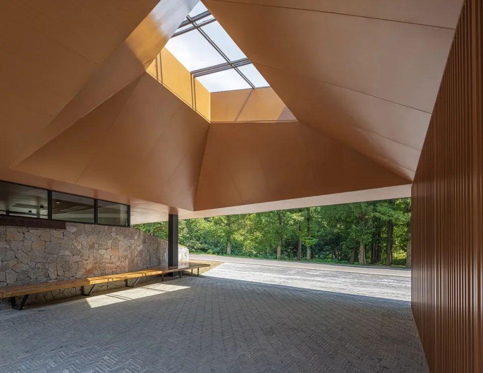 逐渐升高并隐藏围墙的景观地台和交错折叠的屋面成为了组织空间的主体,它们连同后山一起层层退后并相互错位,以此来补足场地处山体的缺陷,并表现出了近、中、远景的层次,让建筑和环境更好地融合在一起。