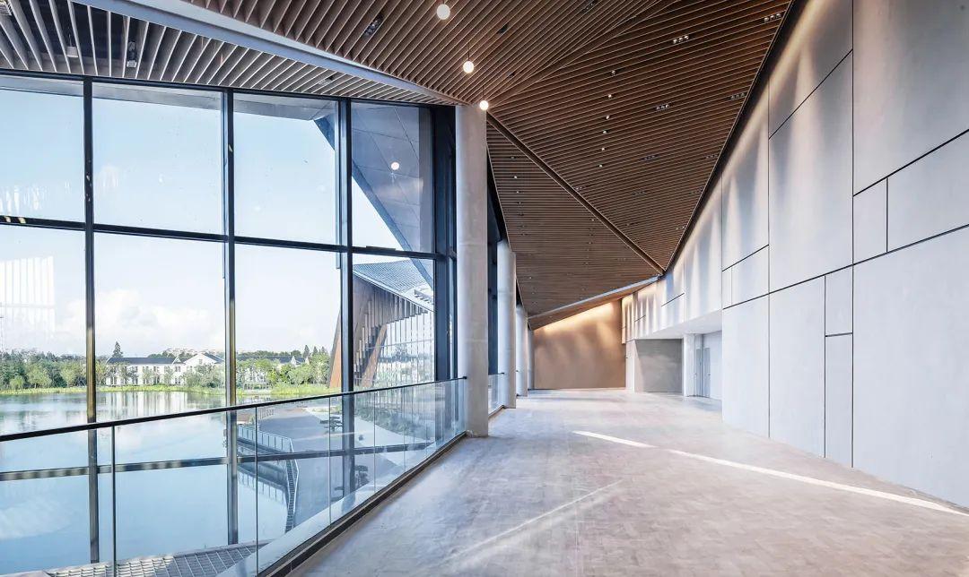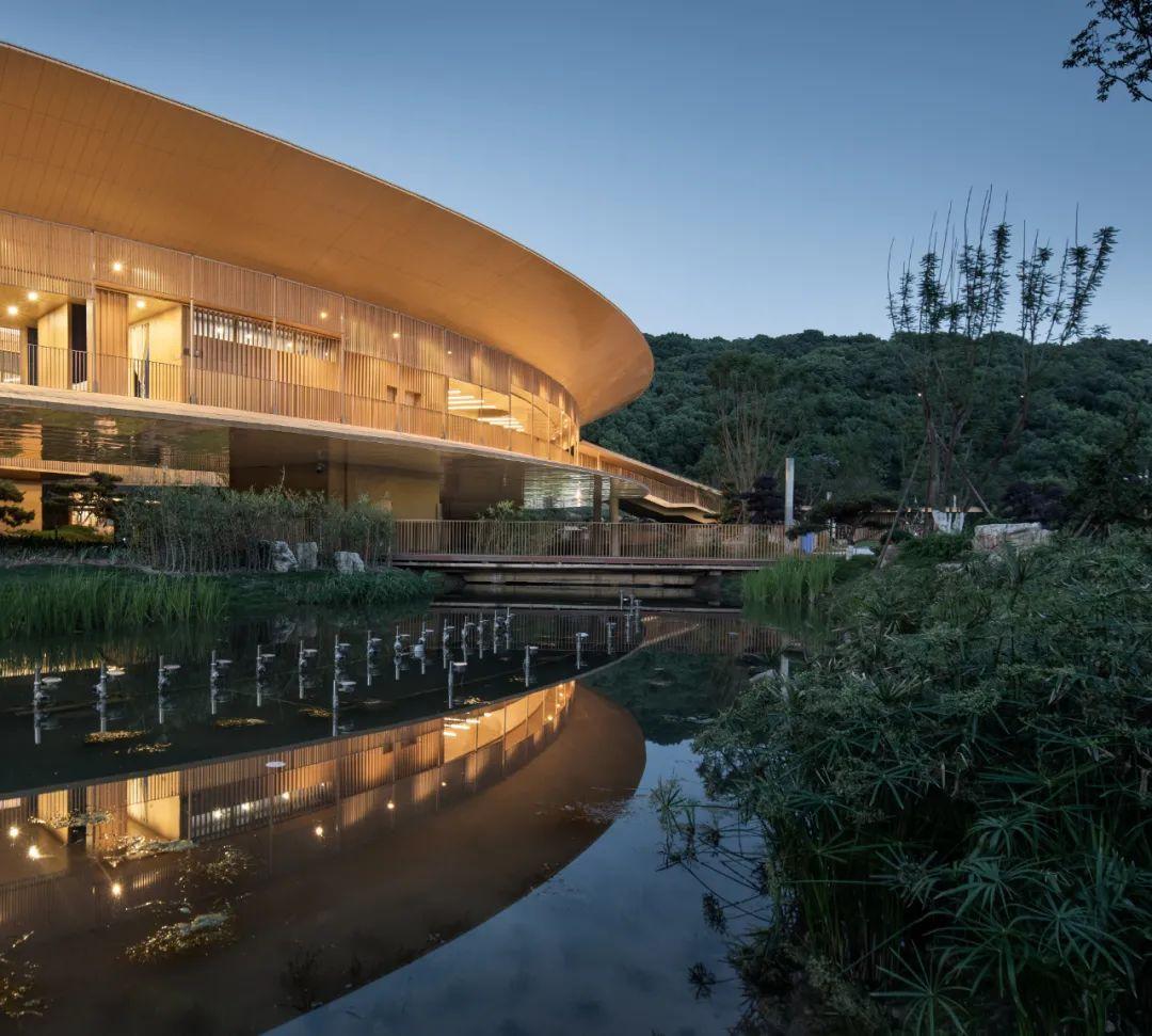 整座建筑和自然环境形成一种“看与被看”的对话关系。当人们沿着湖畔向着游客中心行进的时候,曲折变化的轮廓会呈现出动态的变化,颇有“横看成岭侧成峰”之意。在白天,连续的玻璃幕墙反射天光与湖景的变化,仿佛消隐在环境中;到了夜晚,内部透出的暖光与月色相映成趣,反向勾勒出建筑的轮廓