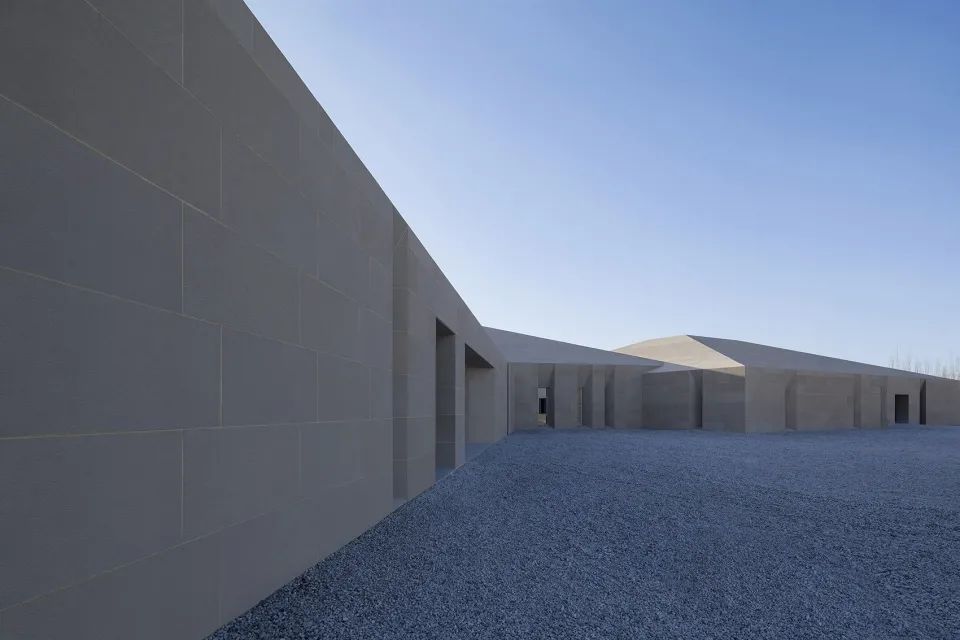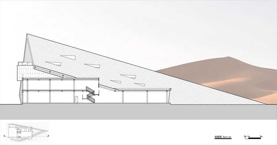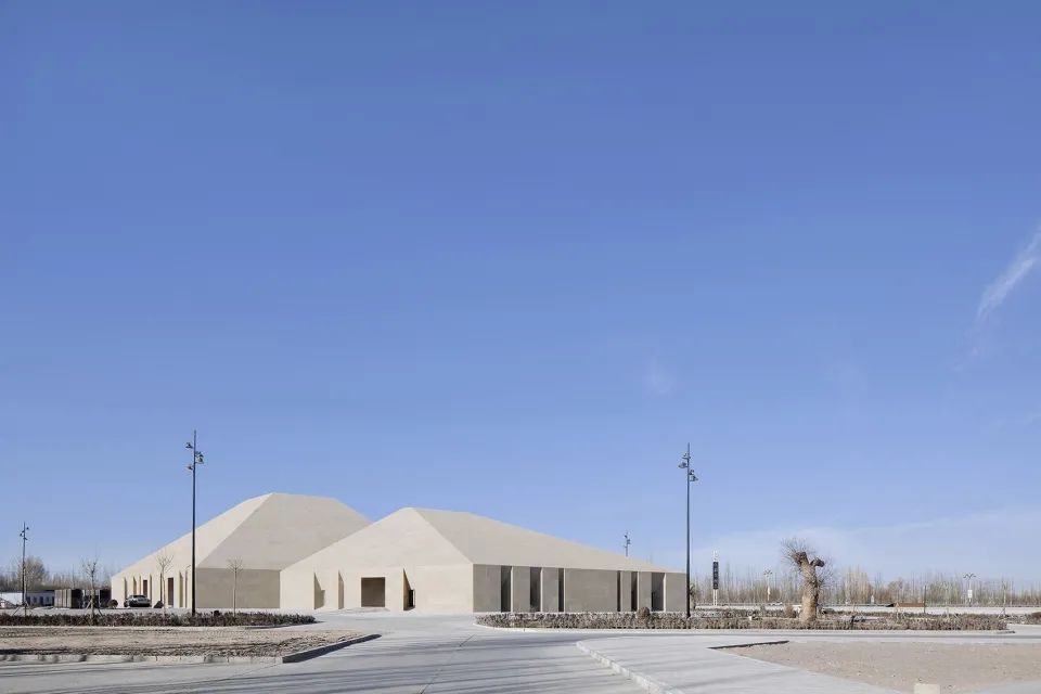 游客集散中心的设计灵感来自绵延起伏的沙丘,在天地间呈现出的鲜明轮廓和阴影体,在形态上与沙丘有着内在的关联,相依在一起的建筑在建筑色彩上和沙丘的颜色同类,屋顶的坡度也如沙丘一样缓行。主体建筑根据综合服务、办公后勤、特色餐饮和旅游展示等功能分成四个体块。它们之间相互联系,以半围合的群落式布局,静静等待着来自远方的游人。嵌入在厚重石材中的开口,被阳光雕刻出强有力的几何光影。