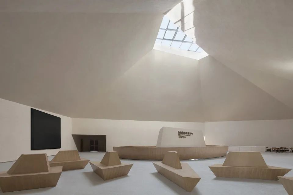 天窗”做为一个改变内部光照并指引空间趋向的要素被引入设计中。在入口、公共区域相关的体量中,平天窗和梯形的洞口引入了天光,使得立面弱化的情况下依然能较为清晰地指引主要空间的所在。